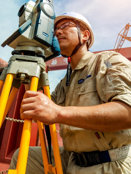 近40度的高溫天氣下,一位造船精度人堅(jiān)守崗位,使用全站儀監(jiān)控船塢每個(gè)搭載總段的定位精度,保障一次搭載到位。