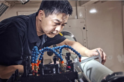 七〇八所海迅公司生產(chǎn)部的員工計(jì)師傅雖已汗如雨下,仍專(zhuān)注于銑床加工之中。