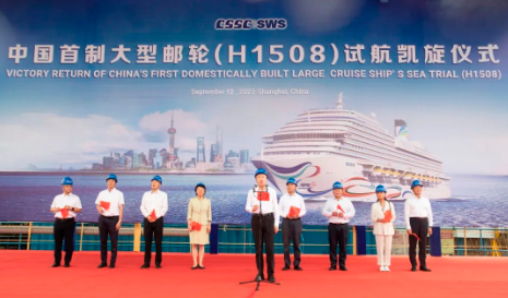 現(xiàn)場舉行了簡短的歡迎儀式。溫剛宣布中國首制大型郵輪完工試航所有驗(yàn)證項(xiàng)目全部達(dá)標(biāo),試航任務(wù)圓滿完成。