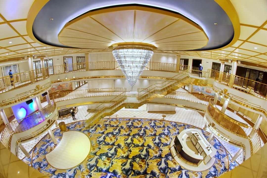 國產(chǎn)首艘大型郵輪總噸位13.55萬噸,長323.6米,寬37.2米,設(shè)計(jì)吃水8.26米,最大高度72.2米。全船搭載107個(gè)系統(tǒng)、5萬5千個(gè)設(shè)備,包含2500萬個(gè)零部件,完工敷設(shè)4750公里電纜、365公里管系、120公里風(fēng)管。船上有客房2125間,可容納乘客5246人,配置了高達(dá)16層、面積4萬平方米的生活?yuàn)蕵饭矃^(qū)域,被譽(yù)為“海上現(xiàn)代化城市”。