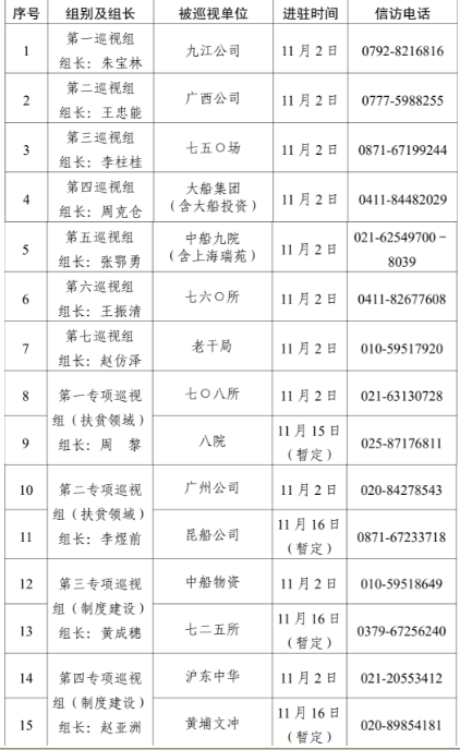 根據(jù)中國船舶集團黨組對2020年第二輪巡視工作的統(tǒng)一部署,截止11月2日,集團公司黨組7個常規(guī)巡視組已全部完成進駐,對九江公司、廣西公司、七五〇場、大船集團(含大船投資)、中船九院(含上海瑞苑)、七六〇所、老干局等7家單位開展常規(guī)巡視。集團公司黨組4個專項巡視組采取“一托二”方式同步對七〇八所、八院、廣州公司、昆船公司、中船物資、七二五所、滬東中華、黃埔文沖等8家單位開展扶貧領域、制度建設專項巡視,4個專項巡視組目前均已進駐首家被巡視單位。