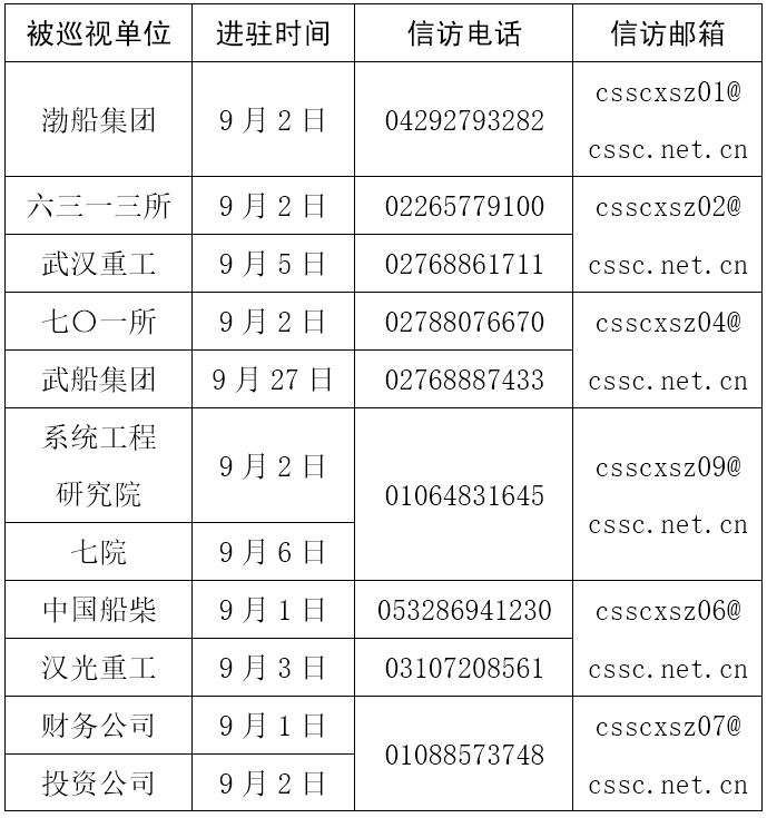 根據(jù)集團(tuán)公司黨組對2021年第二輪巡視工作的統(tǒng)一部署,截至9月6日,集團(tuán)公司黨組巡視組已基本完成進(jìn)駐,對渤船集團(tuán)等單位黨組織開展巡視,現(xiàn)場巡視約40天。 現(xiàn)場巡視期間,巡視組信訪電話如下: