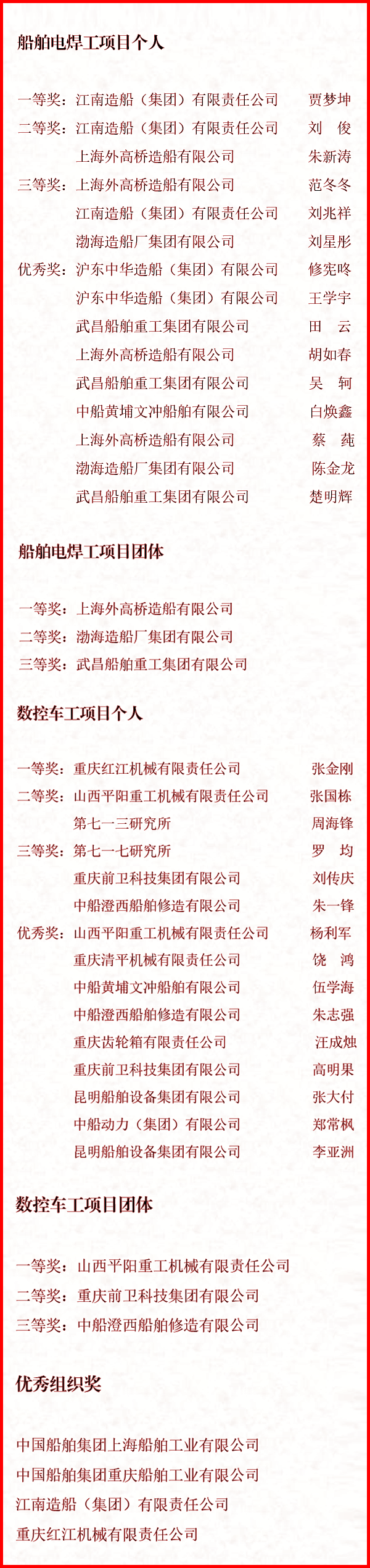 9月27日至9月30日,中國船舶集團(tuán)有限公司聯(lián)合中國就業(yè)培訓(xùn)技術(shù)指導(dǎo)中心,在上海、重慶兩地成功舉辦了國家二類競賽——“2021年全國行業(yè)職業(yè)技能競賽—中國船舶集團(tuán)有限公司職業(yè)技能競賽”。來自49家成員單位共計(jì)128名選手同臺(tái)角逐,最終評(píng)選出個(gè)人及團(tuán)體一、二、三等獎(jiǎng)和個(gè)人優(yōu)秀獎(jiǎng),優(yōu)秀組織獎(jiǎng)等獎(jiǎng)項(xiàng)。