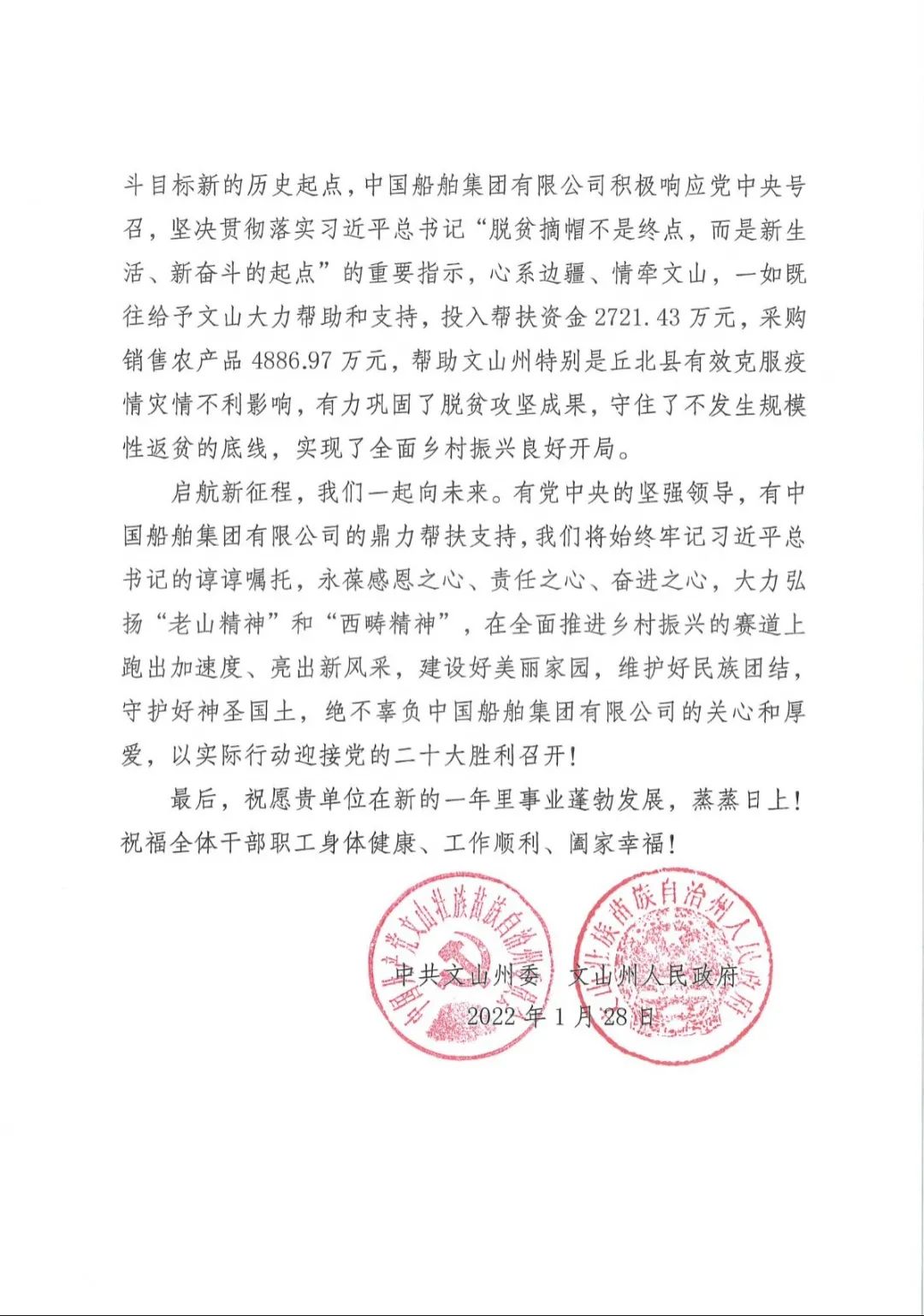 春節(jié)前夕,中國船舶集團(tuán)陸續(xù)收到云南省委省政府、文山州委州政府、鶴慶縣委縣政府、勐臘縣政府發(fā)來的感謝信,對(duì)集團(tuán)公司長(zhǎng)期以來給予鶴慶縣、勐臘縣、丘北縣的傾力幫扶表示衷心感謝和崇高敬意。