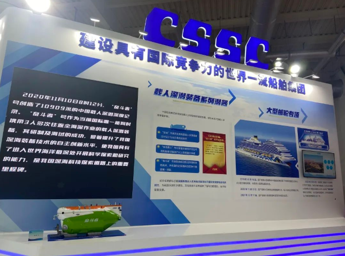 在重大科技專項工程展區(qū),中國船舶集團集中展示了在深海科學(xué)研究和海洋資源開發(fā)領(lǐng)域深化實施的“蛟龍”號、“深海勇士”號、“奮斗者”號三型載人深潛裝備等一批重大科技專項工程,以及取得的突破性、標志性的成果。其中,展會現(xiàn)場展示的“奮斗者”號創(chuàng)造了10909米的中國載人深潛深度紀錄。