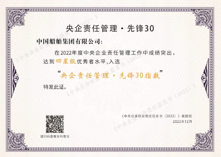 2022年12月20日,由國(guó)務(wù)院國(guó)資委社會(huì)責(zé)任局主辦、中國(guó)社會(huì)責(zé)任百人論壇承辦的“新征程 新責(zé)任——《中央企業(yè)社會(huì)責(zé)任藍(lán)皮書(2022)》《國(guó)資國(guó)企社會(huì)責(zé)任藍(lán)皮書(2022)》發(fā)布活動(dòng)”在京舉行?;顒?dòng)以“云端會(huì)議”的方式舉辦,發(fā)布了“央企責(zé)任管理 · 先鋒30指數(shù)”,中國(guó)船舶集團(tuán)入選該指數(shù)。