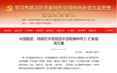 12月18日,學(xué)習(xí)貫徹習(xí)近平新時代中國特色社會主義思想主題教育官網(wǎng)發(fā)布《中國船舶:持續(xù)在學(xué)思踐悟中汲取精神偉力 匯聚奮進力量》。中國船舶集團通過繪好“施工圖”、念好“三字經(jīng)”、用好“五字訣”等扎實開展好主題教育,切實以主題教育成果推動集團公司加快建設(shè)世界一流船舶集團。