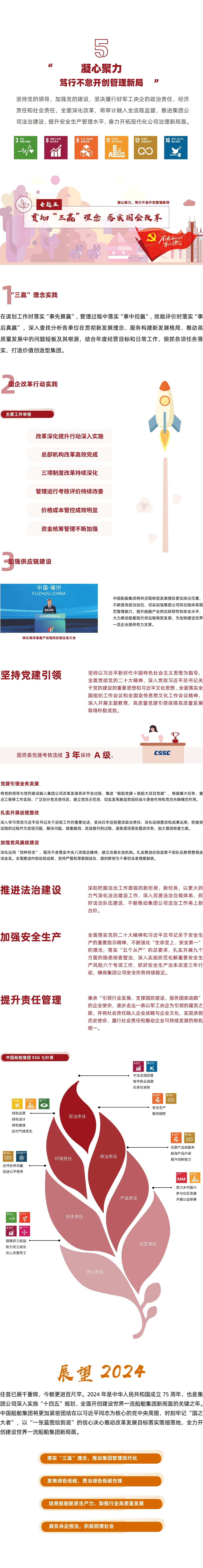 《報告》講述了中國船舶集團貫徹新發(fā)展理念,堅持價值創(chuàng)造,發(fā)展壯大主業(yè)實業(yè),增強經(jīng)營管理能力,加快深化改革,建設(shè)世界一流船舶集團的成績。主體章節(jié)圍繞“強軍勝戰(zhàn),乘風(fēng)破浪逐夢萬里海天”“向海圖強,披荊斬棘打造大國重器”“綠色發(fā)展,踐行低碳共建生態(tài)文明”“勇?lián)姑?,眾志成城奏響和諧樂章”“凝心聚力,篤行不怠開創(chuàng)管理新局”五個方面全面展示了中國船舶集團履行政治責任、經(jīng)濟責任、環(huán)境責任、社會責任的實踐成效。
