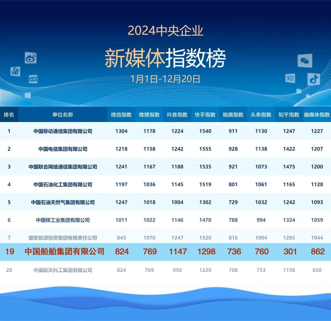 2024年——中船集團新媒體平臺綜合指數(shù)進(jìn)入2024年度中央企業(yè)新媒體指數(shù)榜前20!