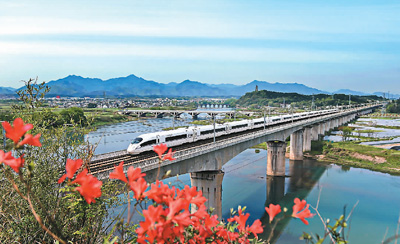 4月14日,一列動(dòng)車(chē)穿行“中國(guó)最美高鐵”合福線新安江休寧古城巖大橋。徐 明攝(人民視覺(jué))