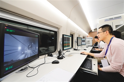 6月20日,西(安)成(都)高鐵陜西段聯(lián)調(diào)聯(lián)試正式啟動(dòng)。圖為當(dāng)高速綜合檢測(cè)列車(chē)穿越秦嶺時(shí),技術(shù)人員在監(jiān)測(cè)列車(chē)運(yùn)行數(shù)據(jù)。新華社記者 李一博攝