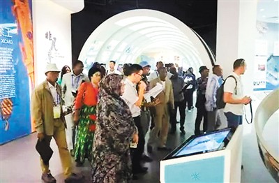 來自非洲12個(gè)發(fā)展中國家基礎(chǔ)設(shè)施建設(shè)及規(guī)劃相關(guān)部門的高級(jí)官員在徐工集團(tuán)展廳內(nèi)參觀。