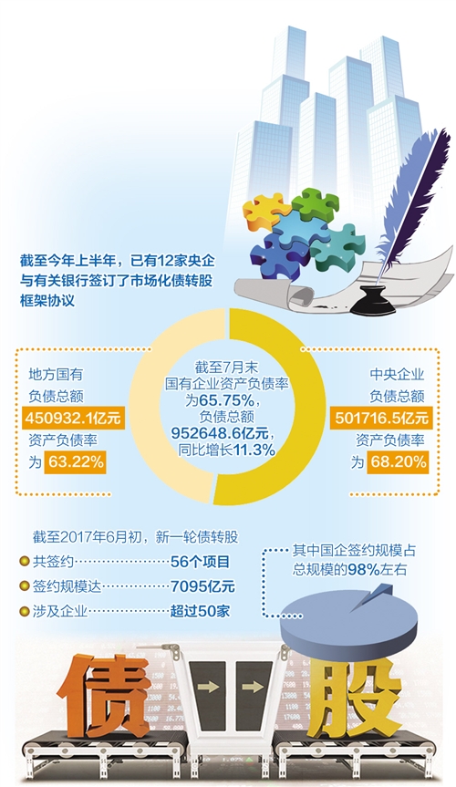 數(shù)據(jù)顯示,截至2017年6月初,我國新一輪債轉(zhuǎn)股共簽約56個(gè)項(xiàng)目,簽約規(guī)模達(dá)7095億元,涉及企業(yè)超過50家,其中以國企為主,簽約規(guī)模占總規(guī)模的98%左右。