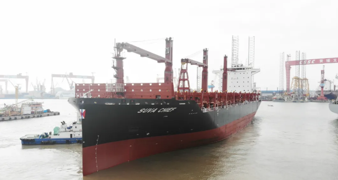 1月4日上午,交付的“SUVA CHIEF”號(hào),這是黃埔文沖攜手中船貿(mào)易為新加坡太古公司建造的2750TEU集裝箱船3號(hào)船。