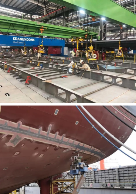 安環(huán)保衛(wèi)部安保消員工堅守崗位,保障大型郵輪作業(yè)安全;集配部碼頭鋼板抓緊卸貨,全力保障生產(chǎn);制造二部400余名員工投入大型郵輪薄板分段建造;涂裝部800余名員工對大型郵輪/民船關(guān)鍵項目進行涂裝;搭載部1300余名員工堅守崗位保證船塢節(jié)點;總裝一部400余人圍繞止鏈器/艙口圍導軌安裝等開展生產(chǎn),總裝二部對大型郵輪總段扣壓管穿艙件進行焊接;生產(chǎn)保障部開展大型郵輪臨時電力系統(tǒng)新式電箱改造。