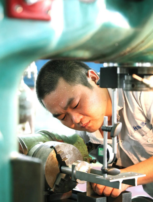 七〇八所海迅公司生產(chǎn)部的員工計師傅雖已汗如雨下,仍專注于銑床加工之中。