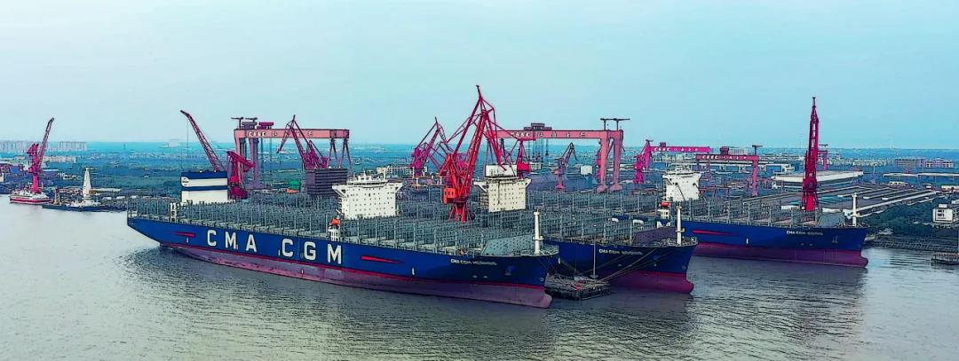 “海上綠巨人”系列箱船是滬東中華近期的重點產(chǎn)品。三艘15000TEU集裝箱船列隊整齊,滬東中華建造團(tuán)隊開足馬力,奮戰(zhàn)金秋。該型號集裝箱船是當(dāng)今世界綠色環(huán)保船型,國產(chǎn)化率達(dá)到90%,可靈活布置于全球各個重要航線。