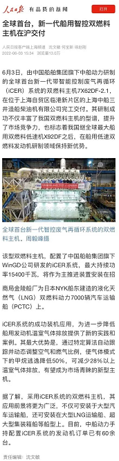 該型雙燃料主機(jī),配置了中國(guó)船舶集團(tuán)旗下WinGD公司研發(fā)的iCER系統(tǒng),最大持續(xù)功率15400千瓦,將作為主推進(jìn)裝置安裝在招商局金陵船廠為日本NYK船東建造的液化天然氣(LNG)雙燃料動(dòng)力7000車汽車運(yùn)輸船(PCTC)上。