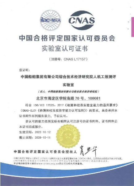 近日,中國船舶集團旗下中船綜合院人機工效測評實驗室(以下簡稱“實驗室”)獲得中國合格評定國家認可委員會(CNAS)實驗室認可證書,成為國內首家具備國家認可人機工效測評能力的試驗機構。