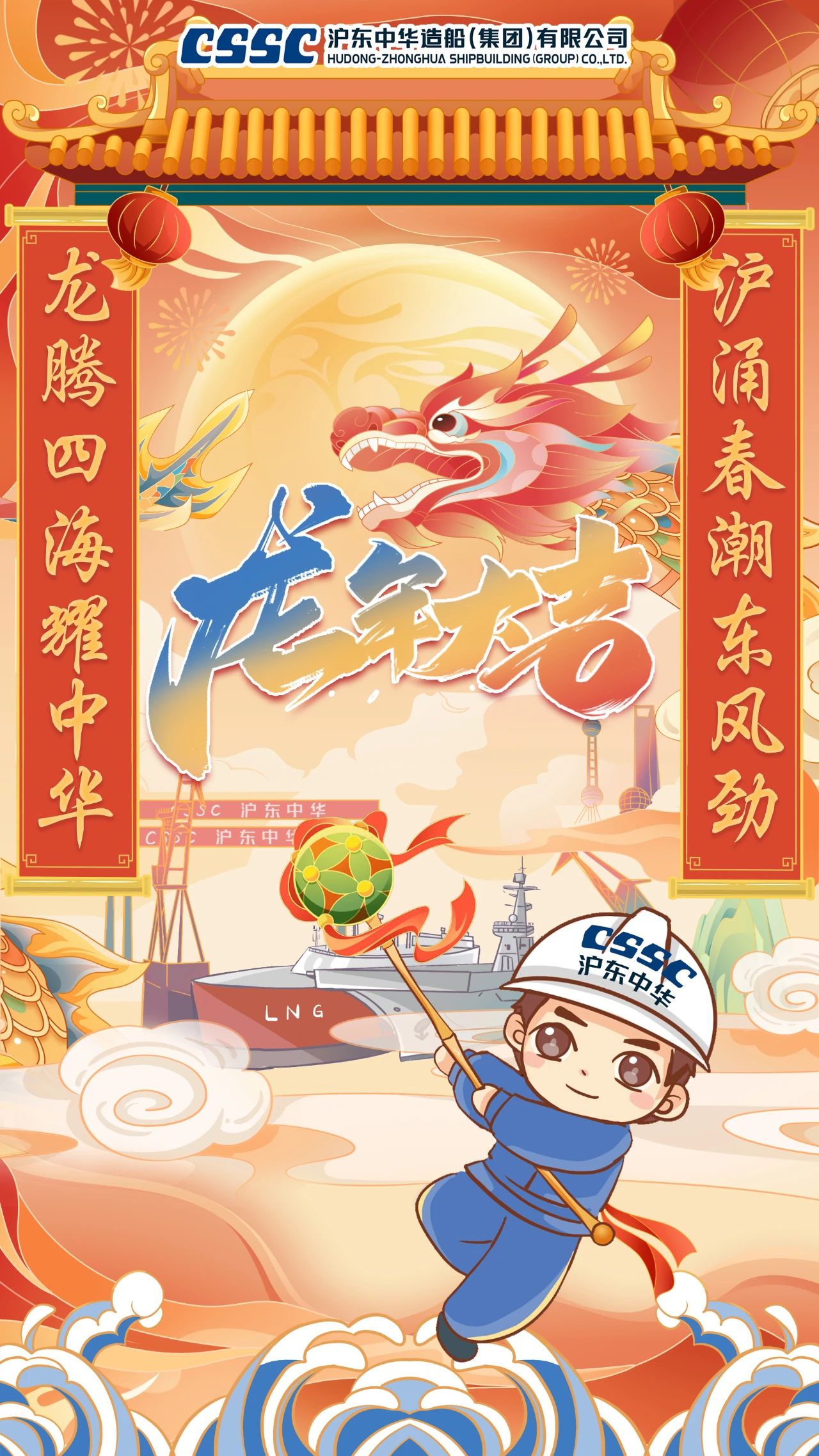創(chuàng)意說(shuō)明:海報(bào)中“江小南”舞起龍頭,預(yù)示著在新的一年,江南造船將賡續(xù)努力,龍頭揚(yáng)起、再創(chuàng)新績(jī)!而跟隨舞動(dòng)的則是目前江南造船在建的集裝箱船、液化氣船和汽車(chē)滾裝船等主產(chǎn)品系列。