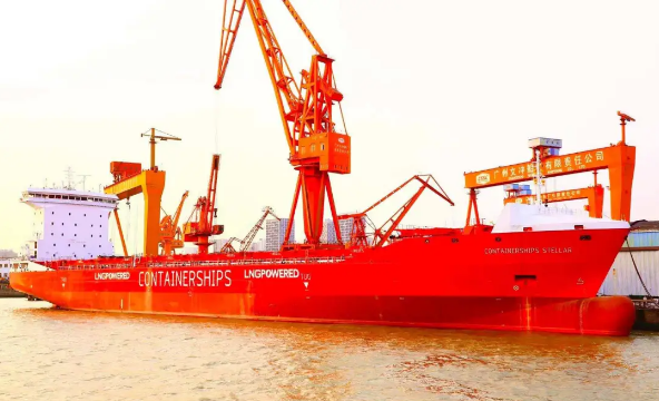 5月12日,黃埔文沖為法國(guó)達(dá)飛輪船集團(tuán)建造的1400TEU雙燃料集裝箱“CONTAINERSHIPS STELLAR”號(hào)交付。