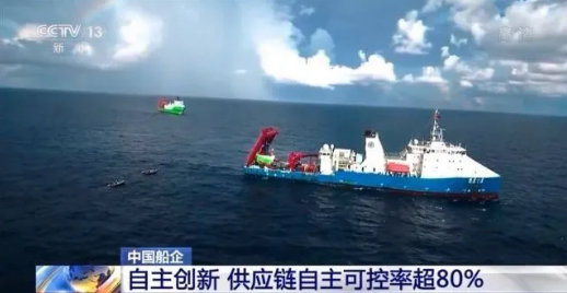 這是去年“奮斗者”號載人潛水器在馬里亞納海溝10909米處成功坐底的畫面,由中國船舶集團研制的“奮斗者”號載人潛水器是我國首臺具備全球海域載人進入能力的重要裝備。據(jù)測算,“奮斗者”號的國產(chǎn)化率超過了96.5%。同樣在民用船舶方面,整船的國產(chǎn)化率也有明顯提升。這是由中國船舶廣船國際完成的阿爾及利亞客滾船,具有完全的自主知識產(chǎn)權(quán)。