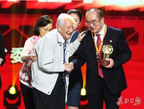 當(dāng)95歲高齡的黃老出現(xiàn)在舞臺上時,張定宇快步向前迎接,這一幕令人動容。黃老在攙扶下,為張定宇戴上獎?wù)?,“能為你頒獎,我感到很榮幸。你是祖國的驕傲,人民的英雄!”