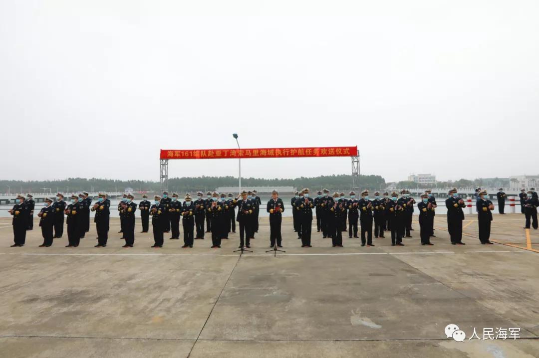 軍樂隊奏響《歡送進行曲》,編隊艦艇依次解纜,緩緩駛離碼頭,任務官兵整齊列隊、士氣高昂,向祖國和人民揮手告別。