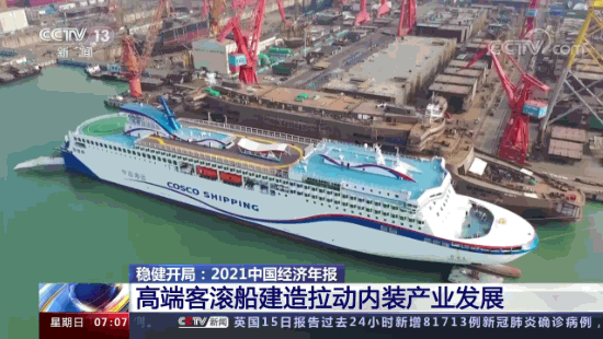 這里是中國船舶廣船國際的造船碼頭,多艘大型豪華客滾船正在緊張調試和建造。負責人告訴記者,2021年,像這樣的高端客滾船他們廠一共建造完工了5艘,產值占比達到約40%。