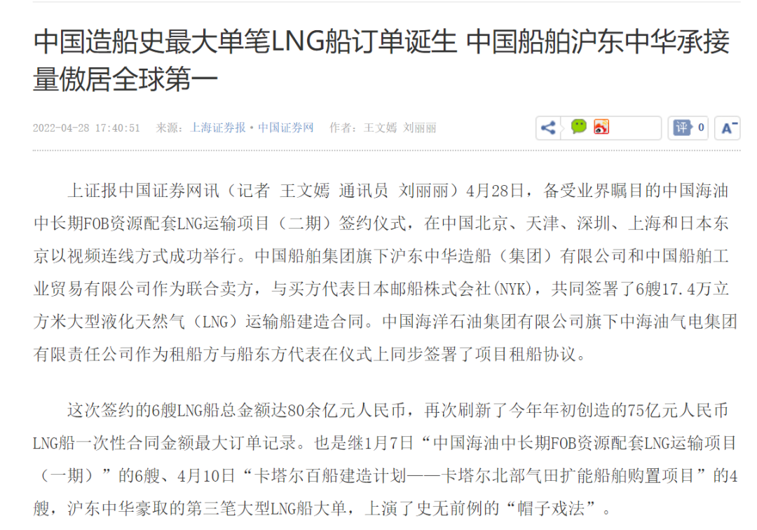 4月28日,中國(guó)海油中長(zhǎng)期FOB資源配套LNG運(yùn)輸項(xiàng)目(二期)簽約儀式,在中國(guó)北京、天津、深圳、上海和日本東京以視頻連線方式成功舉行。中國(guó)船舶集團(tuán)有限公司旗下滬東中華和中船貿(mào)易作為聯(lián)合賣方,與買方代表日本郵船株式會(huì)社(NYK),共同簽署6艘17.4萬(wàn)立方米大型液化天然氣(LNG)運(yùn)輸船建造合同。