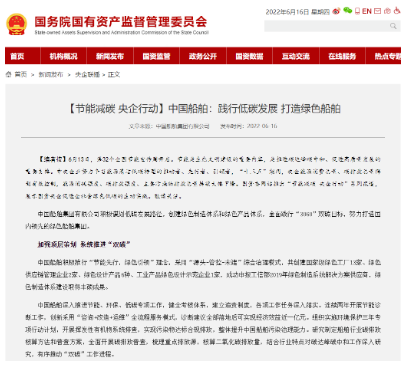 【編者按】6月13日,第32個(gè)全國(guó)節(jié)能宣傳周開(kāi)啟。節(jié)能是生態(tài)文明建設(shè)的重要內(nèi)容,是推進(jìn)碳達(dá)峰碳中和、促進(jìn)高質(zhì)量發(fā)展的重要支撐。中央企業(yè)努力爭(zhēng)當(dāng)能源清潔低碳轉(zhuǎn)型的推動(dòng)者、先行者、引領(lǐng)者,“十三五”期間,央企能源消費(fèi)總量、碳排放總量得到有效控制,能源消耗強(qiáng)度、碳排放強(qiáng)度、主要污染物排放總量持續(xù)大幅下降。6月16日,國(guó)資委網(wǎng)站在“節(jié)能減碳 央企行動(dòng)”系列報(bào)道中,展示中國(guó)船舶集團(tuán)有限公司促進(jìn)社會(huì)綠色低碳的生動(dòng)實(shí)踐。