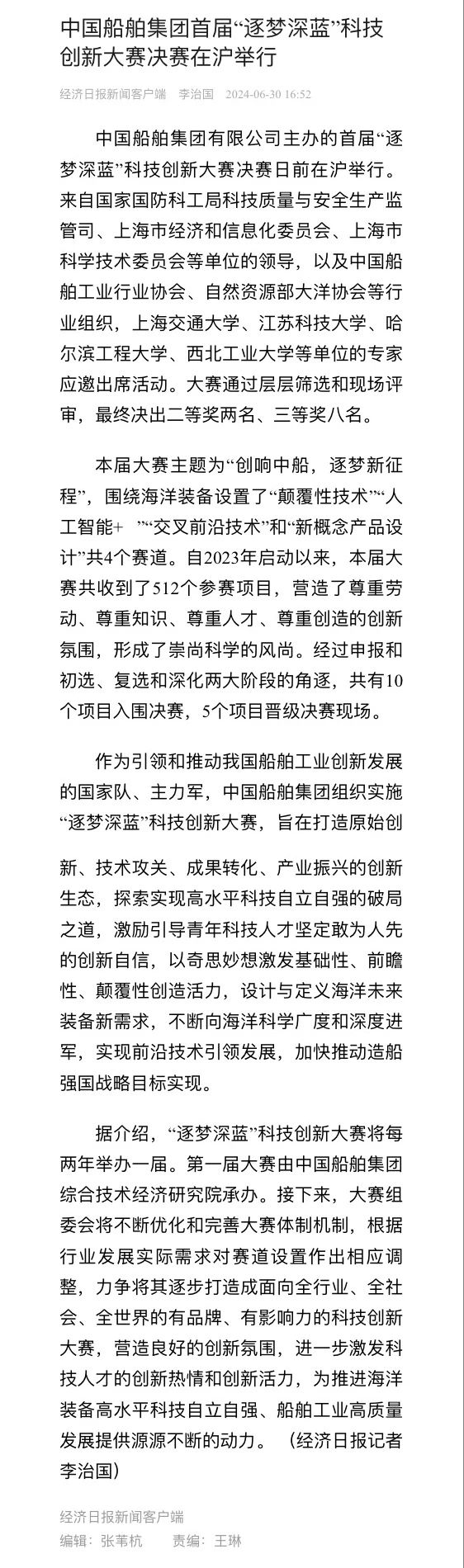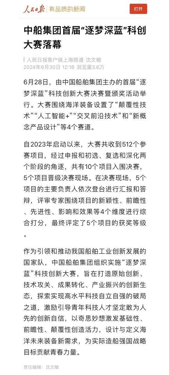 中國船舶集團有限公司主辦的首屆“逐夢深藍”科技創(chuàng)新大賽決賽暨頒獎活動引來各大媒體的關(guān)注,獲得高度評價。——>活動回顧